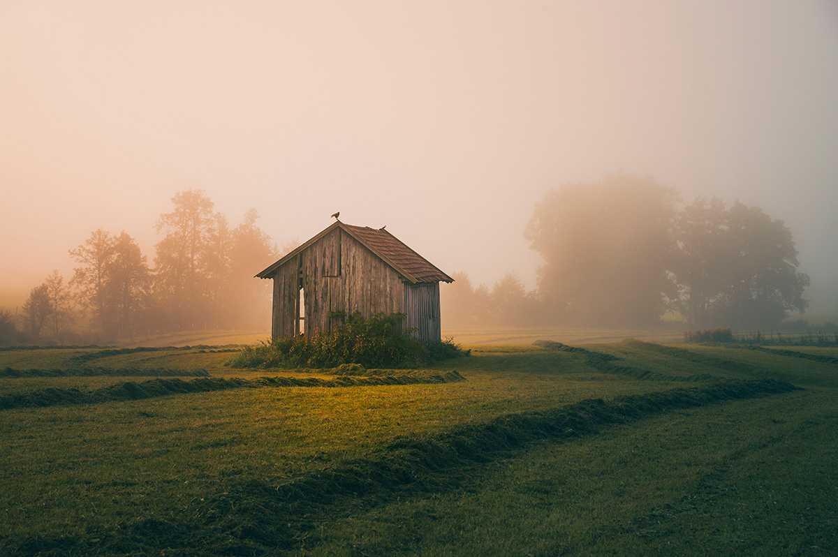 Motiv Die letzte Mahd des Jahres liegt noch auf dem Feld. Die verfallene Hütte steht einsam auf Wiese. Mit den ersten Sonnenstrahlen weichen die Herbstnebel.