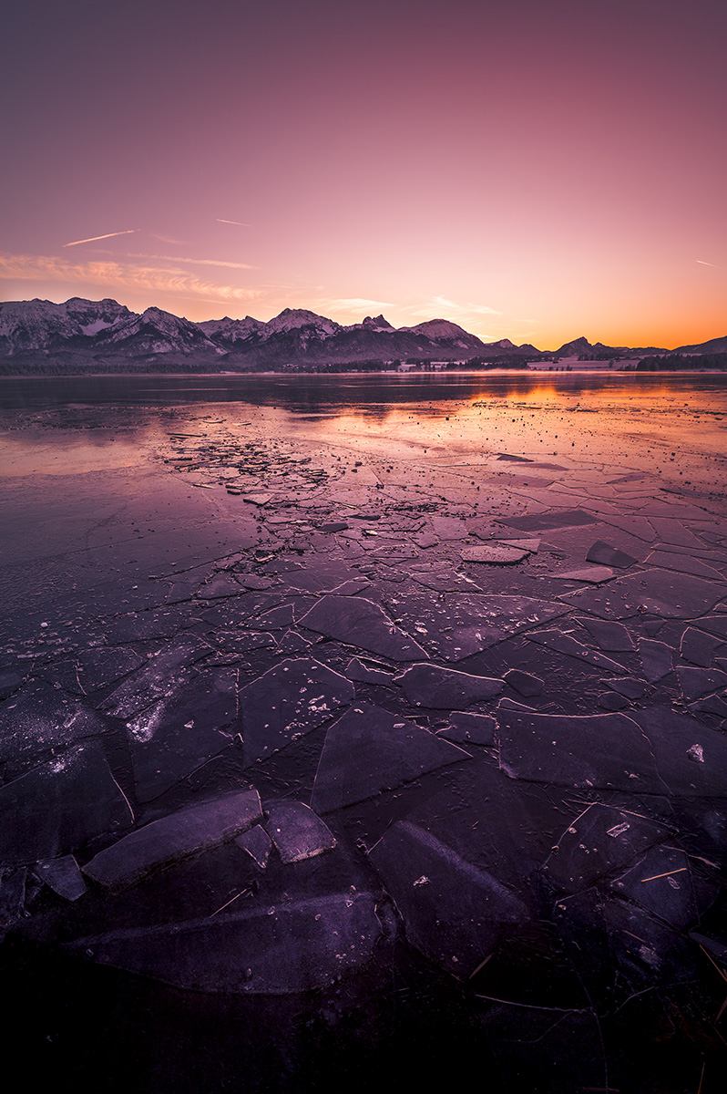 Motiv Farbenfroher Sonnenuntergang über dem gefrorenen Hopfensee in Hopfen am See im Ostallgäu. Die Eisplatten im Vordergrund wirken, als hätte sich ein Eisbrecher seinen Weg durchs Eis gebahnt. (Hochformat)