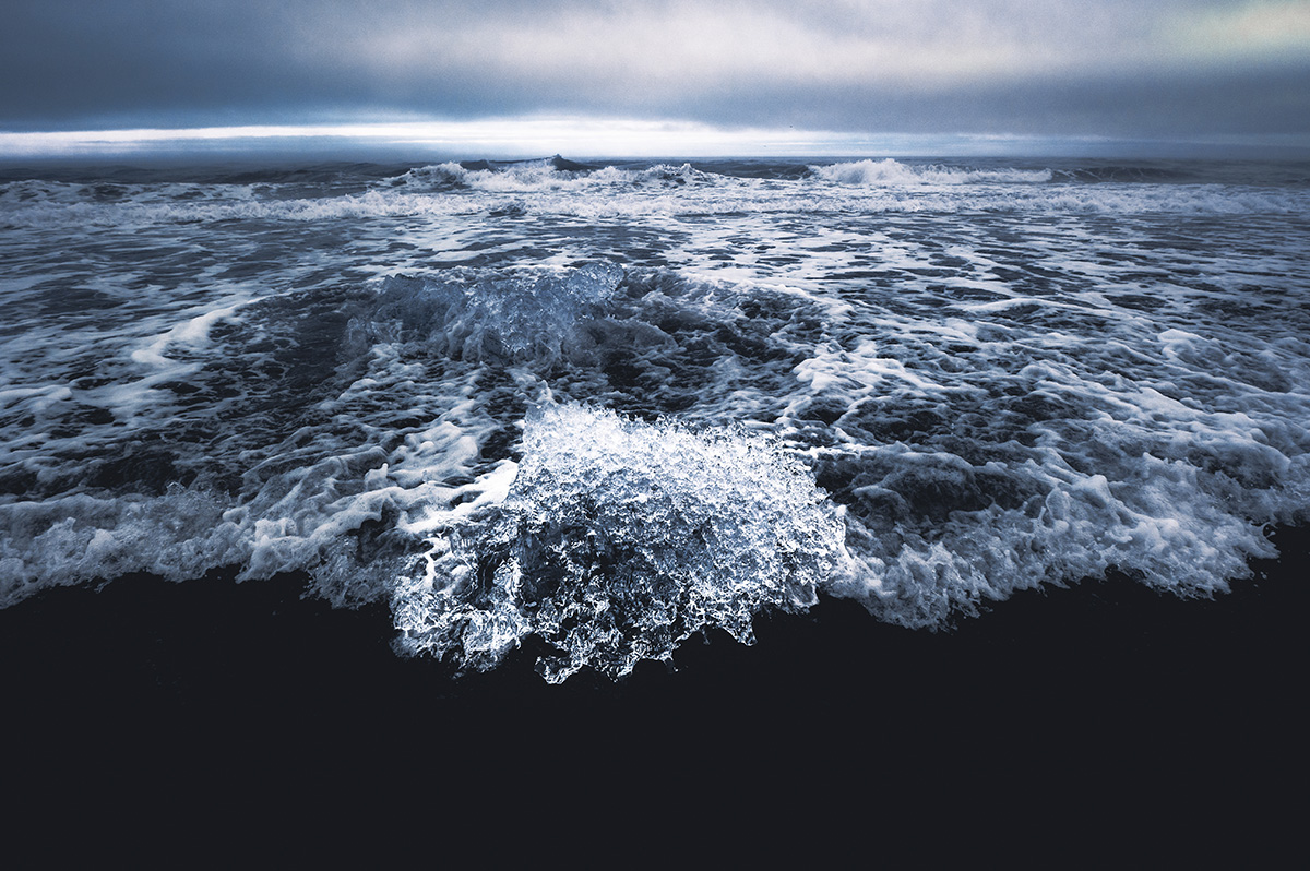 Motiv Ein Eiskristall umtost von den Wellen des Polarmeeres am schwarzen Diamond Beach in Island.