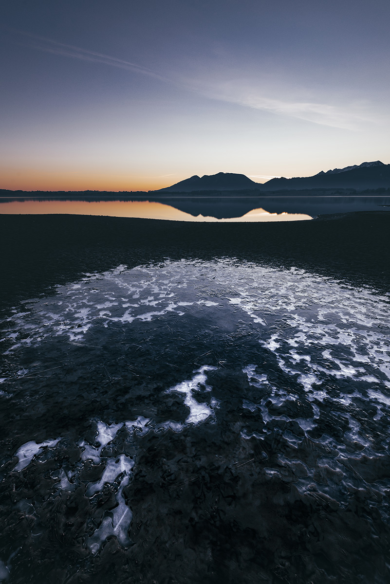 Motiv Ein schneidend kalter, klarer Wintermorgen im abgelassenen Forggensee bei Füssen. Der Seeboden ist geforen. Die Kälte kriecht über die Füße schon in den Körper. Doch am Horizont kündigt ein buntes Farbenspiel die aufgehende Sonne an.