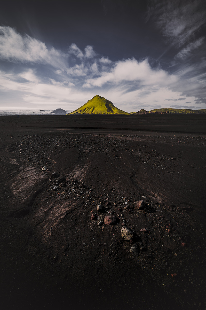 Motiv Eine lange, mühsame Fahrt durch ausgeräumte isländische Vulkanlandschaften. Plötzlich erscheint am Horizont der alte, moosüberwachsene Vulkankegel des Maelifaell, wie eine Verbindung zwischen der schwarzen verbrannten Erde und dem blauen Himmel. (Hochformat)