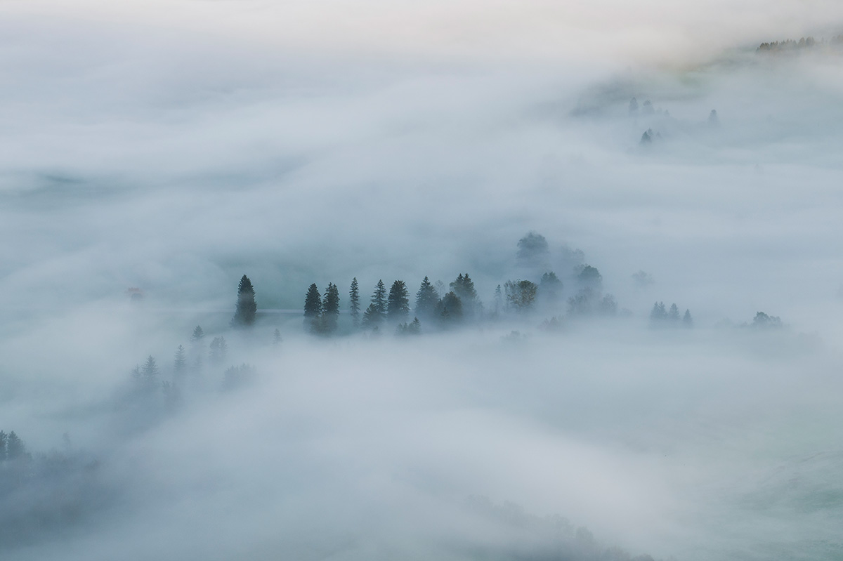 Motiv Wie in einem Aquarell verschwimmen herbstlicher Nebel und einzelne im Nebelmeer auftauchende Bäume und Landschaftsformen auf diesem Foto. Aufgenommen früh am Morgen an einem kalten Herbstmorgen im Ostallgäu nach einem anstrengenden, aber lohnenden Bergaufstieg. (Querformat)