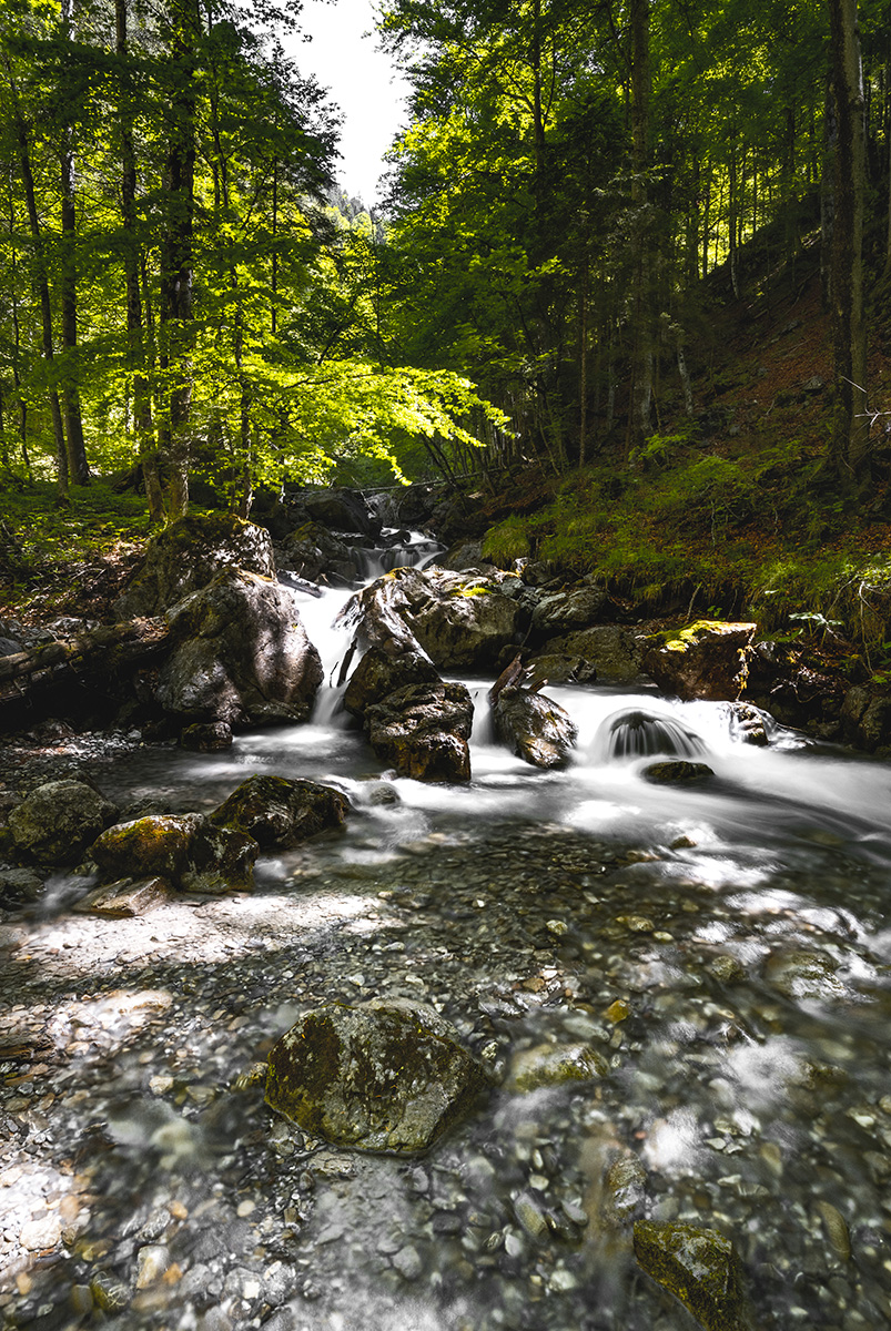 Motiv Alles fließt #3. Diesen schönen Wasserlauf mit kleinen Kaskaden kann man beim Aufstieg vom Christlesee über den Hölltobel nach Gerstruben entdecken.