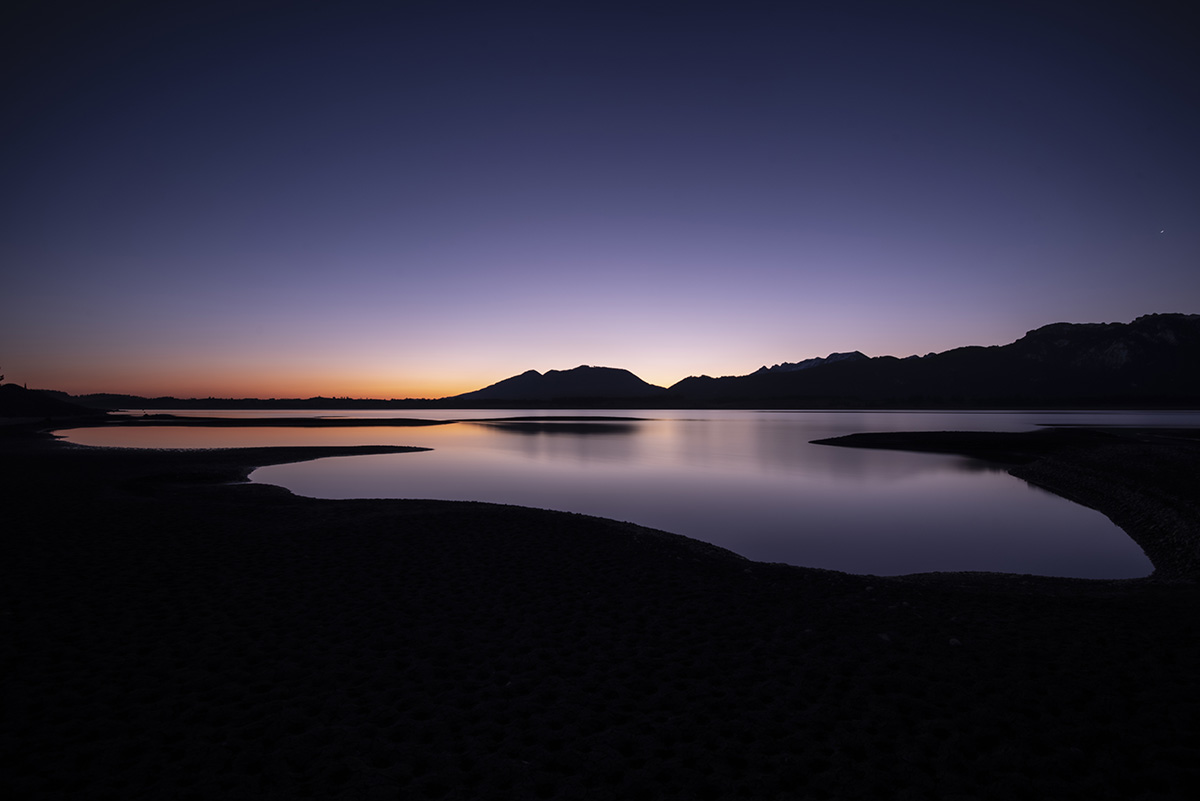 Motiv Der Sonnenaufgang am teilabgelassenen Forggensee bei Füssen im Allgäu kündigt sich nach einer dunklen und eiskalten Nacht farbenfroh an. Absolute Stille, keine Menschenseele weit und breit. Von Minute zu Minute verändert sich die Stimmung. Trotz der Kälte hat sich das Aufstehen für dieses fantastische Farbenspiel gelohnt. Ein minimalistisches Spiel von Licht und Schatten.