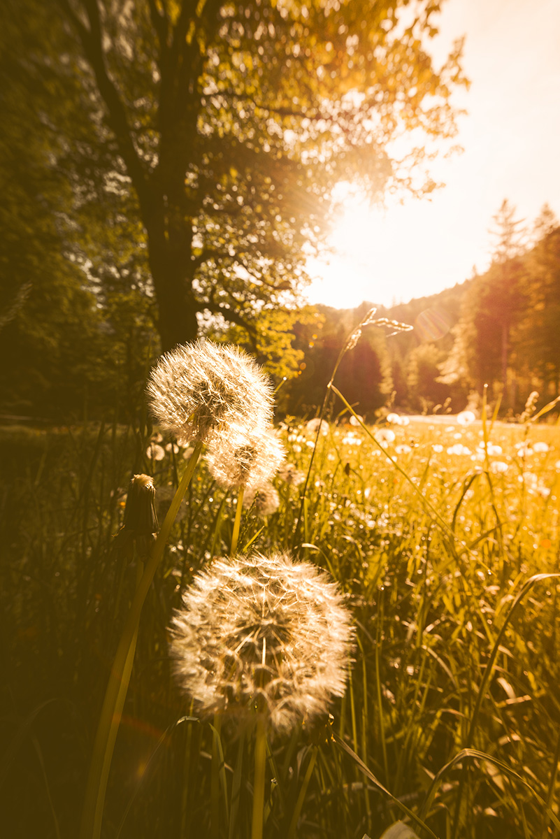 Motiv Frühlingswiese im warmen Gegenlicht mit Pusteblumen