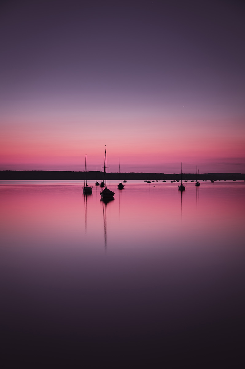 Motiv Wie in einem Scherenschnitt liegen die Segelboote mit ihrer Spiegelung in den letzten Tageslichtresten auf der ruhigen Wasseroberfläche des Ammersees.