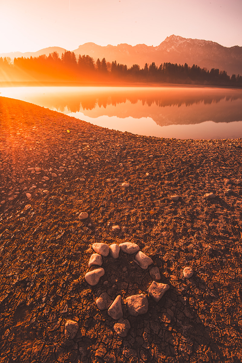 Motiv Wie eine Fata Morgana wirken die letzten Wasserflächen des ausgelassenen Forggensees im morgendlichen Gegenlicht. Im Vordergrund hat sich auf dem ausgetrockneten Seeboden ein unbekannter Künstler mit einem Steinkreis verewigt.
